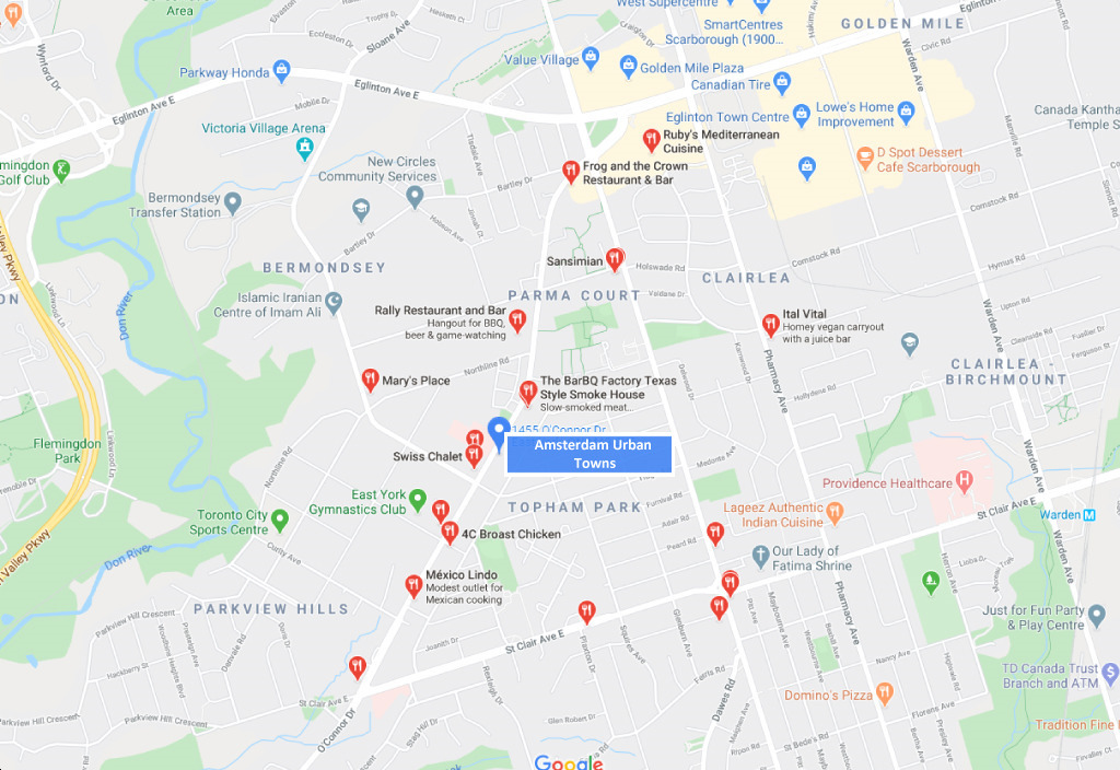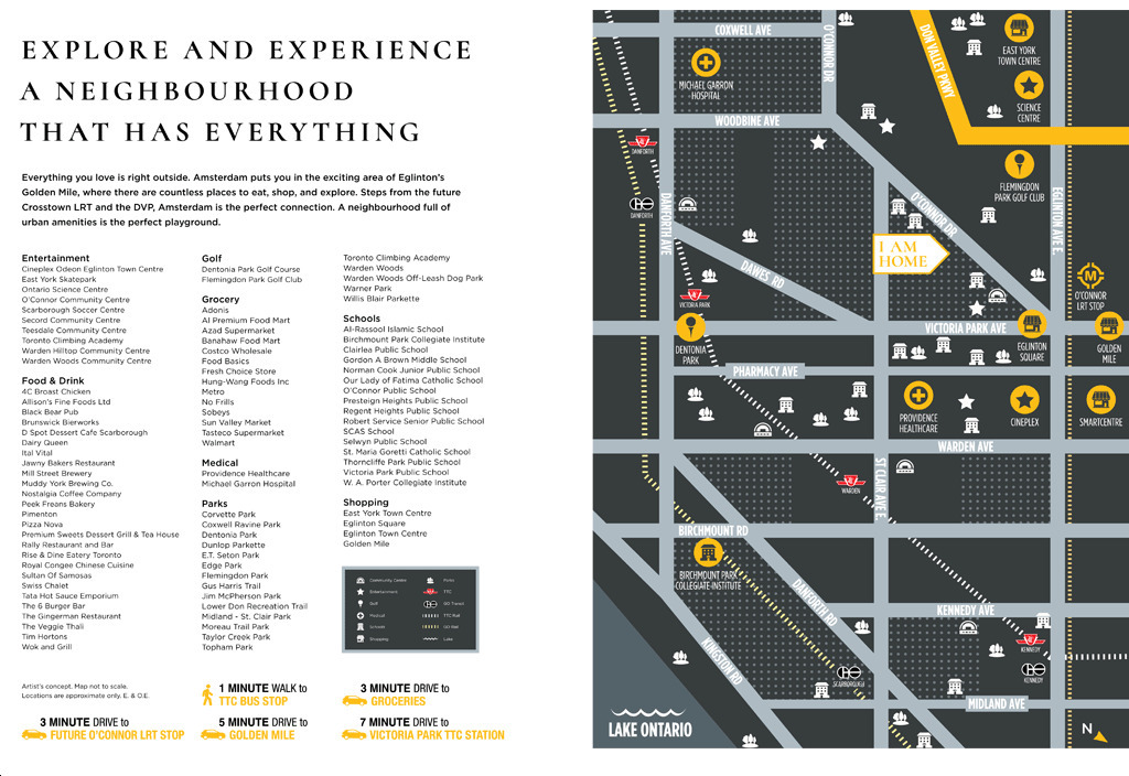 2. Lifestyle Amenities - Located within walking distance of Amsterdam Urban Towns are major city streets including St. Clair Ave. E. and Eglinton Ave. E. Residents will have easy access to the city’s Golden Mile neighbourhood with plenty of dining, shopping, and entertainment options to enjoy. Nearby major city attractions include the Aga Khan Museum and the Ontario Science Centre.