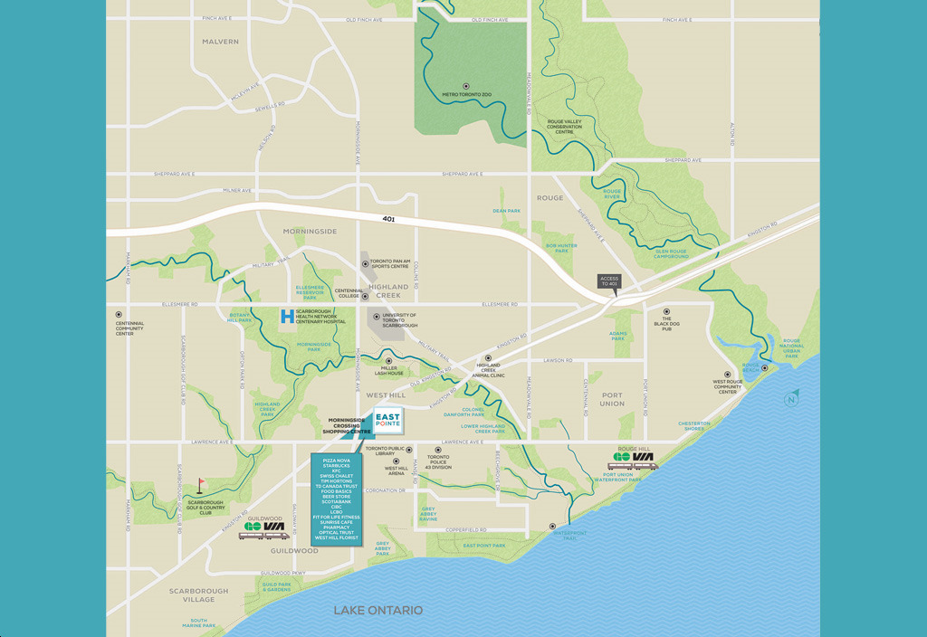 2. Highway Access - Highway 401 is located directly north of East Pointe Condominiums, allowing for residents to easily commute throughout the city and the GTA. CondoNow notes that motorists can commute into major employment hubs in downtown Toronto in just half an hour.