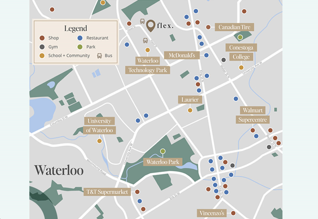 Waterloo is conveniently located just an hour's drive from Toronto and is easily accessible by car, train, or plane. Flex Condos is also located near the picturesque towns and villages of the Niagara region, making it a great home base for exploring Southern Ontario.