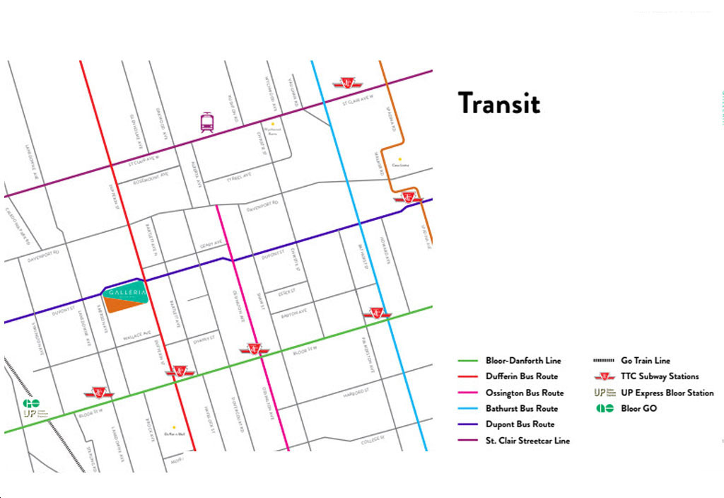 5. Excellent Transit – Residents of Galleria on the Park Condos will have easy access to many transit options in the area. The TTC Bloor Danforth subway line is just a 15-minute walk away and can transport riders to Union Station in just 30 minutes. There are regional bus routes that run along Dupont Street and Dufferin Street, including express and 24-hr service. The Bloor GO Station is also conveniently located nearby.