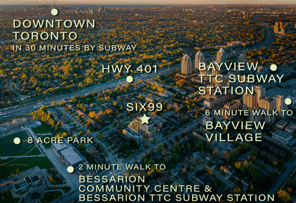 Boasting an excellent Transit Score of 71/100, Six99 Condos is ultimately situated in an extremely convenient North York Location. Residents will be able to walk to Bessarion Station where they will be able to quickly access the TTC subway and bus routes. Oriole GO Station is just minutes from home, offering access to both train and bus lines. Commuting into downtown Toronto using public transportation will only take 35 minutes. With immediate access to Highway 401, motorists will be able to travel efficiently throughout the city and quickly connect to the Don Valley Parkway straight into downtown in just over 20 minutes.