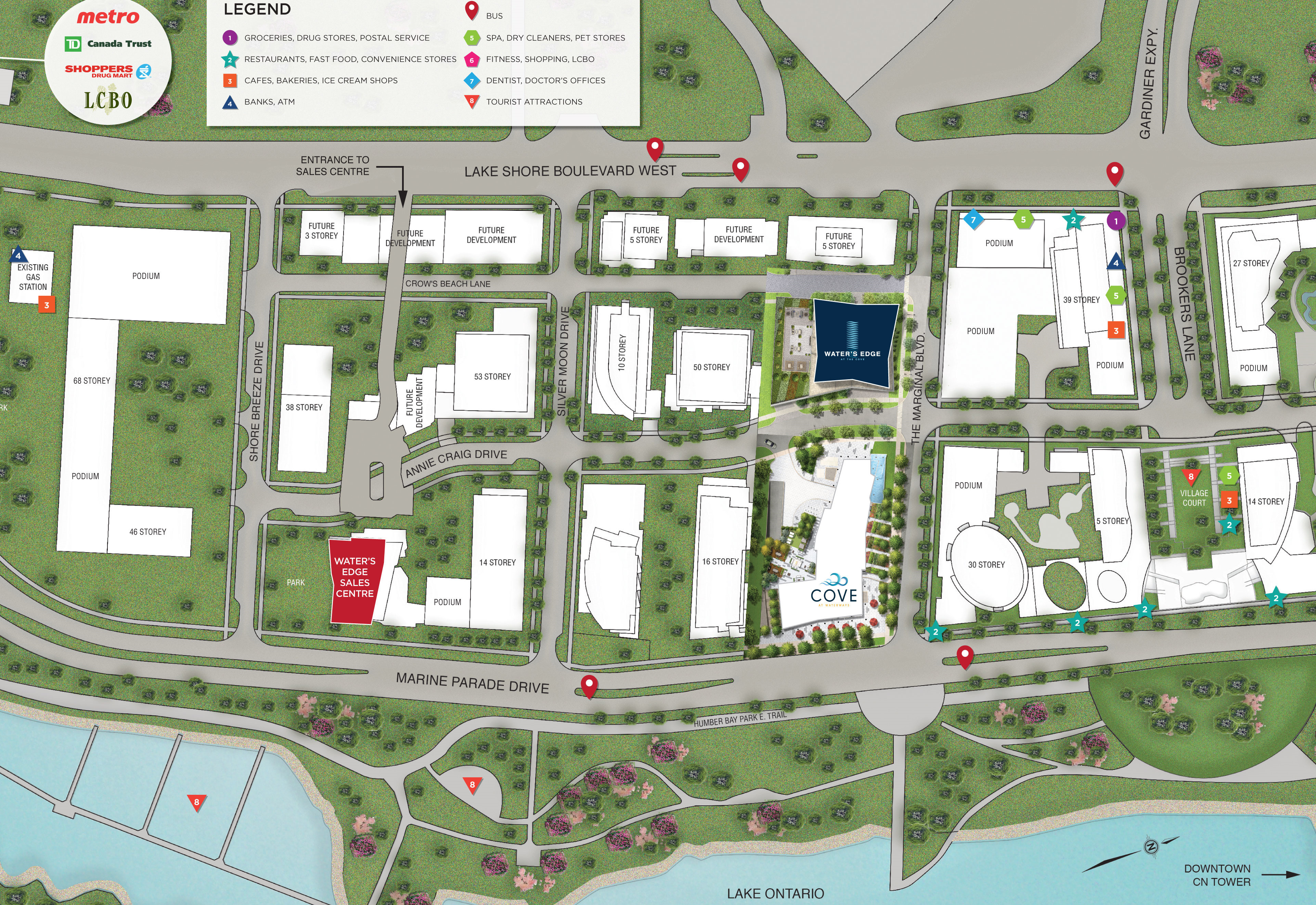 There are many transit options near Cove at Waterways that will connect you all over Etobicoke and Downtown Toronto. TTC stops are all along Lake Shore. Mimico GO Station is a quick drive away for a fast and reliable commute in to city. Also nearby is the Gardiner Expressway.